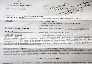 Palandöken Belediye Başkanı Orhan Bulutlar’ın yargıya başvurması üzerine Erzurum Birinci İdare Mahkemesi Başkanı Atılgan Mutlu ve iki üye hakimin verdiği 2011-1199 esas sayılı kararda,”LPG istasyonu kurulmasına yönelik 5216 sayılı Büyükşehir Belediyesi Kanunu’nda dahil herhangi bir kanun tarafından büyükşehir belediyelerine verilmiş böyle bir görev veya hizmetin bulunmadığı dikkate alındığında ilçe belediye sınırları içinde bulunan bir taşınmaz üzerinde akaryakıt ve LPG istasyonunun yapımına yönelik yapı ruhsatı verme yetkisinin Büyükşehir Belediyesine ait olmadığı ve Palandöken İlçe Belediyesine ait olduğu sonucuna varılmıştır.