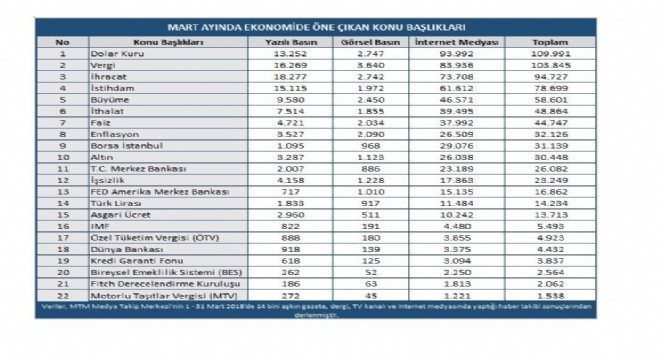 Medya Takip Merkezi, Mart ayı ekonomi karnesini açıkladı. Rapora göre en çok konuşulan ekonomi başlığı, geçtiğimiz ayda olduğu gibi dolar kuru oldu. Dolar, ay boyunca medyada 109 bin 991 haberde yer aldı. Konuşulan diğer bir başlık ise vergi oldu. Maliye Bakanı Naci Ağbal, vergi dairesiyle ilgili işlemleri elektronik ortamda interaktif olarak yapma imkanı getirdiklerini belirtti. 29. Vergi Haftası kapsamında gerçekleştirilen İnteraktif Vergi Dairesi'nin tanıtım toplantısında konuşan Bakan Ağbal, 2017'de vergi gelirlerinde olağanüstü başarı yakaladıklarını söyledi. Mart ayında vergi ile ilgili medyaya 103 bin 845 haber yansıdı.
