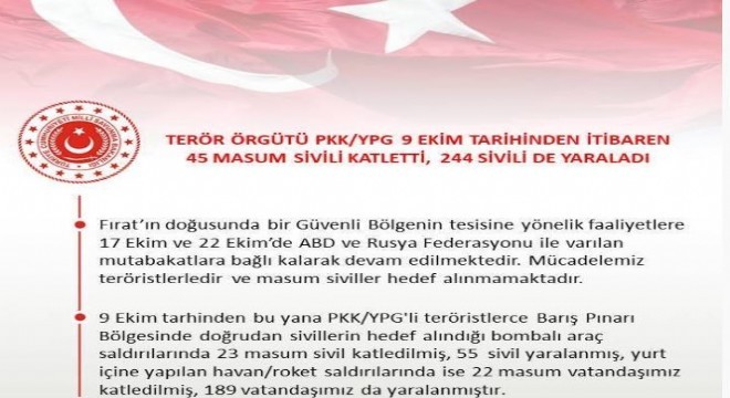 Milli Savunma Bakanlığı, terör örgütü PKK/YPG'nin 9 Ekim tarihinden bugüne kadar toplam 45 masum sivili katlettiğini, 244 sivili de yaraladığını açıkladı.