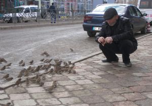 Narman ilçesinde bir esnaf aç kalan serçeleri diğer esnaflardan farklı bir şekilde besliyor.
